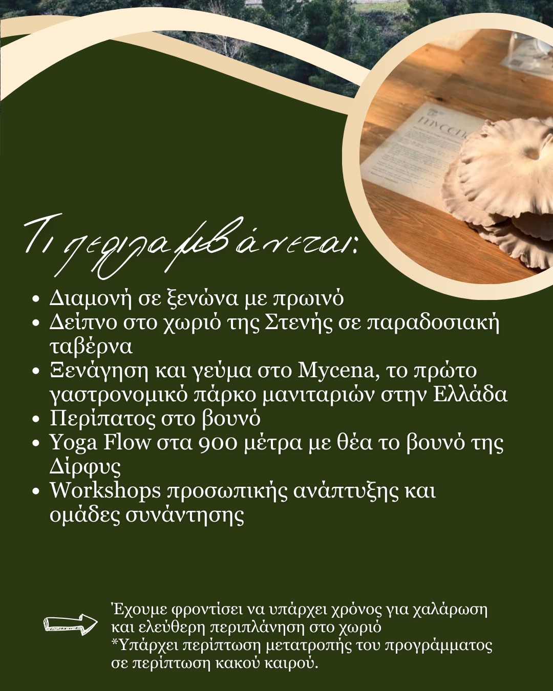 Σε ένα καταπράσινο τοπίο στη Στενή Ευβοίας, σε περιμένει μια εμπειρία που συνδυάζει χαλάρωση, σύνδεση και αναζωογόνηση. Με φόντο το βουνό της Δίρφυς, θα έχεις την ευκαιρία να αποσυνδεθείς από την καθημερινότητα και να επανασυνδεθείς με τον εαυτό σου.