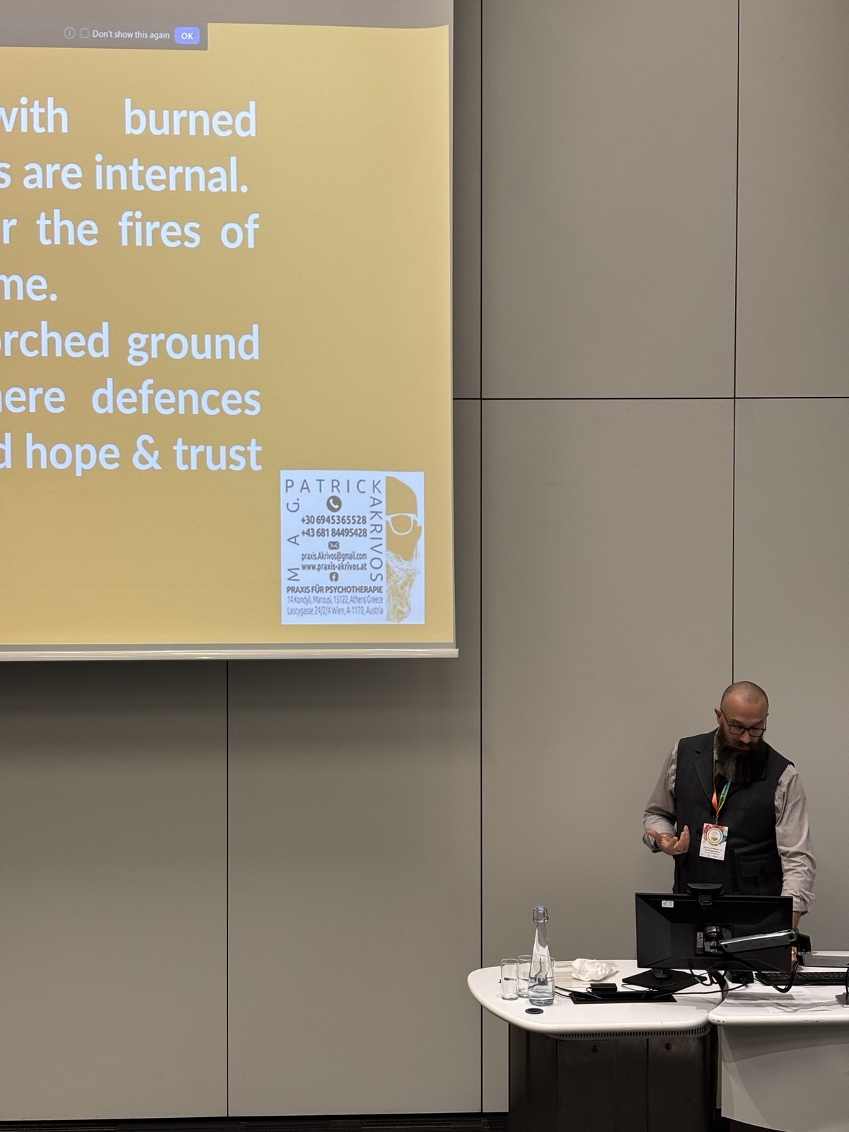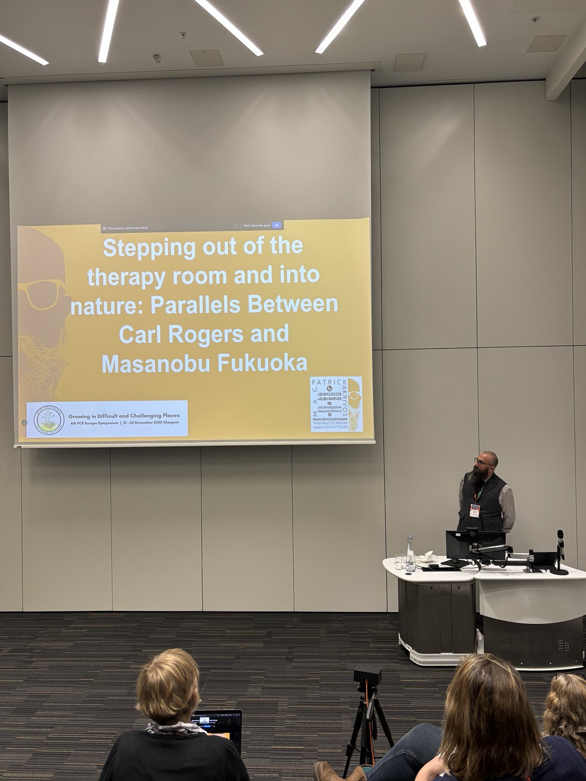 Στο συνέδριο συμμετείχε επίσης ο Patrik Ακριβός, μέλος της ΠΕΕΠΒΙΠ, παρουσιάζοντας μια εισήγηση που διερευνούσε τις βαθιές συνδέσεις ανάμεσα στην προσωποκεντρική προσέγγιση του Carl Rogers και τη φιλοσοφία της φυσικής καλλιέργειας του Masanobu Fukuoka. Εστιάζοντας στην αρχή της έμφυτης τάσης για ανάπτυξη, ανέδειξε πώς αυτή ισχύει τόσο για τον άνθρωπο όσο και για τα φυσικά οικοσυστήματα. Με αφετηρία την «καλλιέργεια του μη-κάνω» του Fukuoka, ο Patrik παρουσίασε πώς η μη-κατευθυντική στάση της προσωποκεντρικής προσέγγισης μπορεί να αποτελέσει μοντέλο για μια πιο αρμονική, βιώσιμη και συνειδητή σχέση με τη φύση.