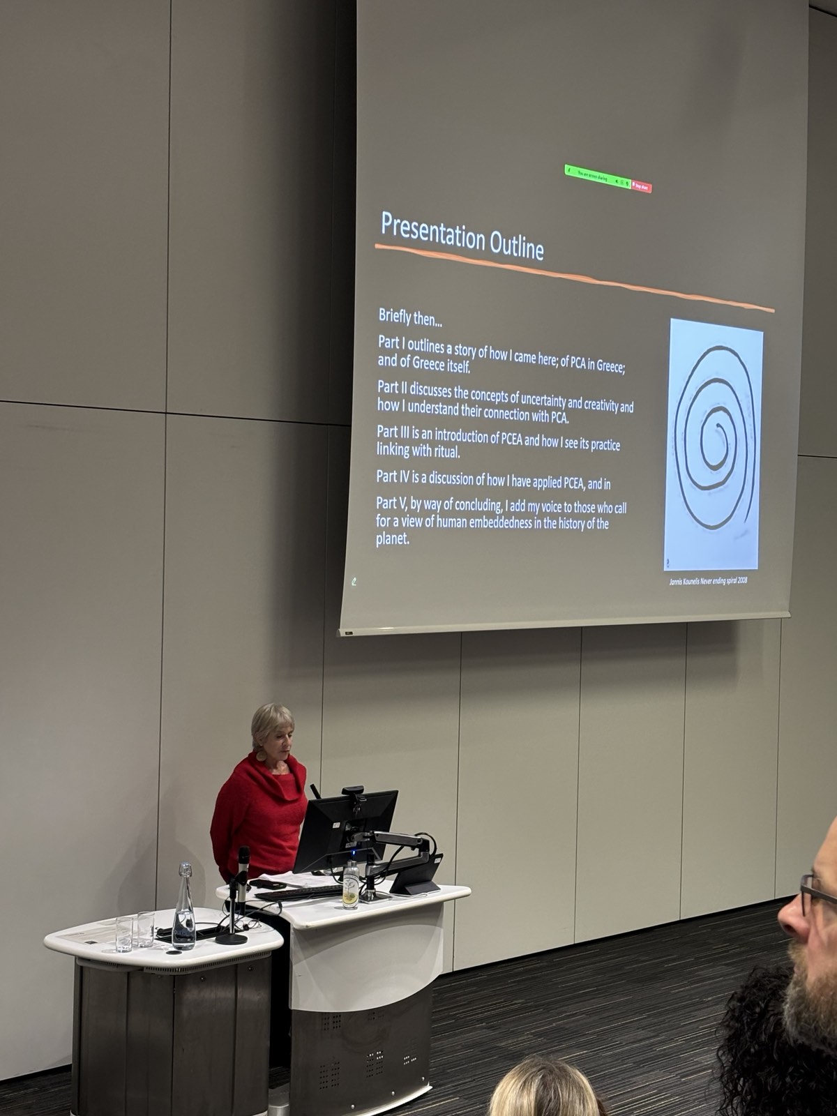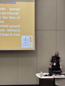 Ως Expressive Arts Facilitator, παρουσίασε τον τρόπο με τον οποίο αξιοποιεί την εκπαίδευσή της για τη δημιουργία εργαστηρίων που ενθαρρύνουν τους εκπαιδευόμενους θεραπευτές να εκφράσουν προσωπικές, επαγγελματικές και κοινωνικές ανησυχίες. Μοιράστηκε την εμπειρία της από τη συνδιοργάνωση PCE/Creative Arts εργαστηρίων και ομαδικών συναντήσεων, τόσο δια ζώσης όσο και διαδικτυακά, με στόχο τη συνεχιζόμενη επαγγελματική ανάπτυξη θεραπευτών και την καλλιέργεια κοινοτήτων πρακτικής. Όπως τόνισε, η δημιουργική διαδικασία δίνει χώρο στους συμμετέχοντες να μοιραστούν εμπειρίες, συναισθήματα και δυνατότητες, ενισχύοντας την αίσθηση του «ανήκειν».